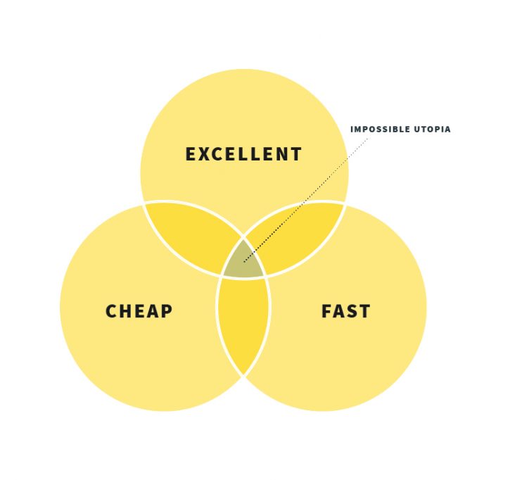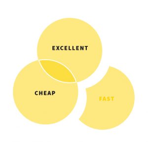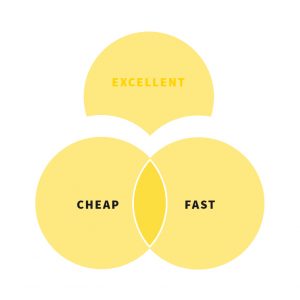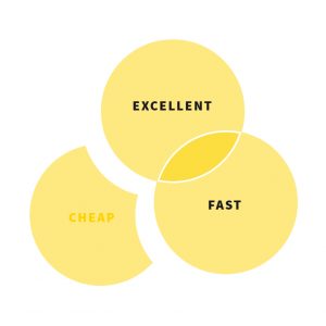 In order to really answer this question, we need to first understand this basic principle. Ideally we all want projects to be super fast, really cheap, and excellent in every way, right? However, it is not possible to get all three. If it actually happens, buy a lottery ticket. Sure, sometimes you hit the jackpot, but that is rare, and it wouldn’t be wise to bank on that happening. Otherwise known as the “Impossible Utopia.”
